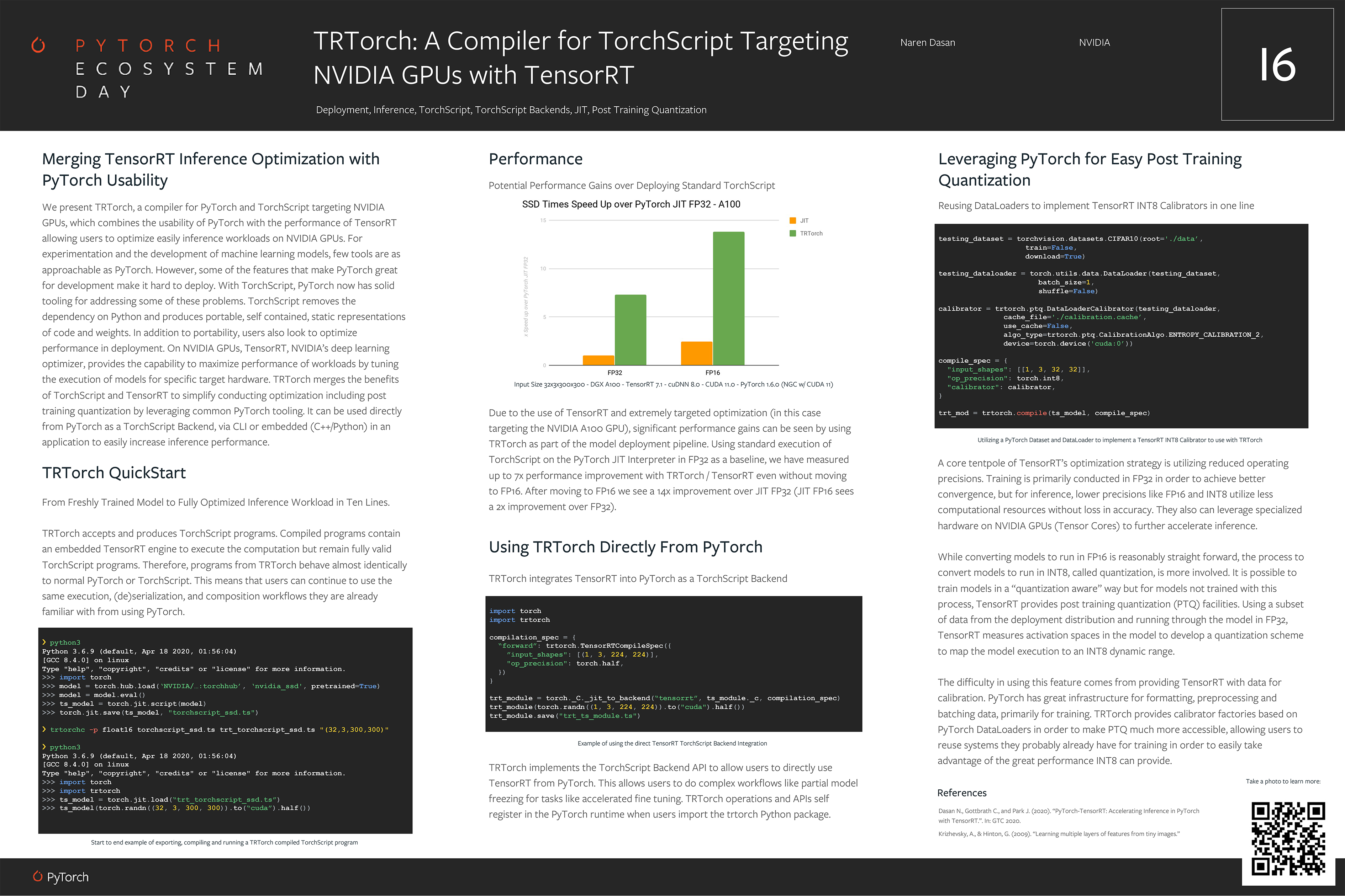 Torch-TensorRT is a inference compiler for PyTorch, targeting NVIDIA GPUs via NVIDIA’s TensorRT Deep Learning Optimizer and Runtime.