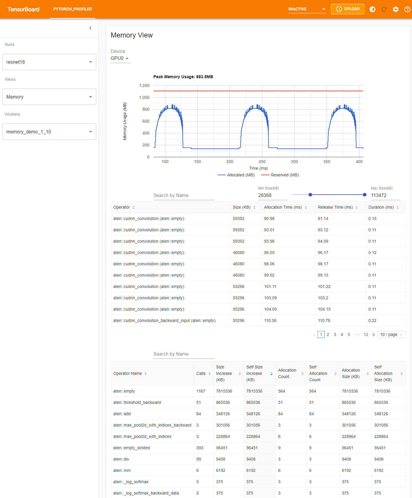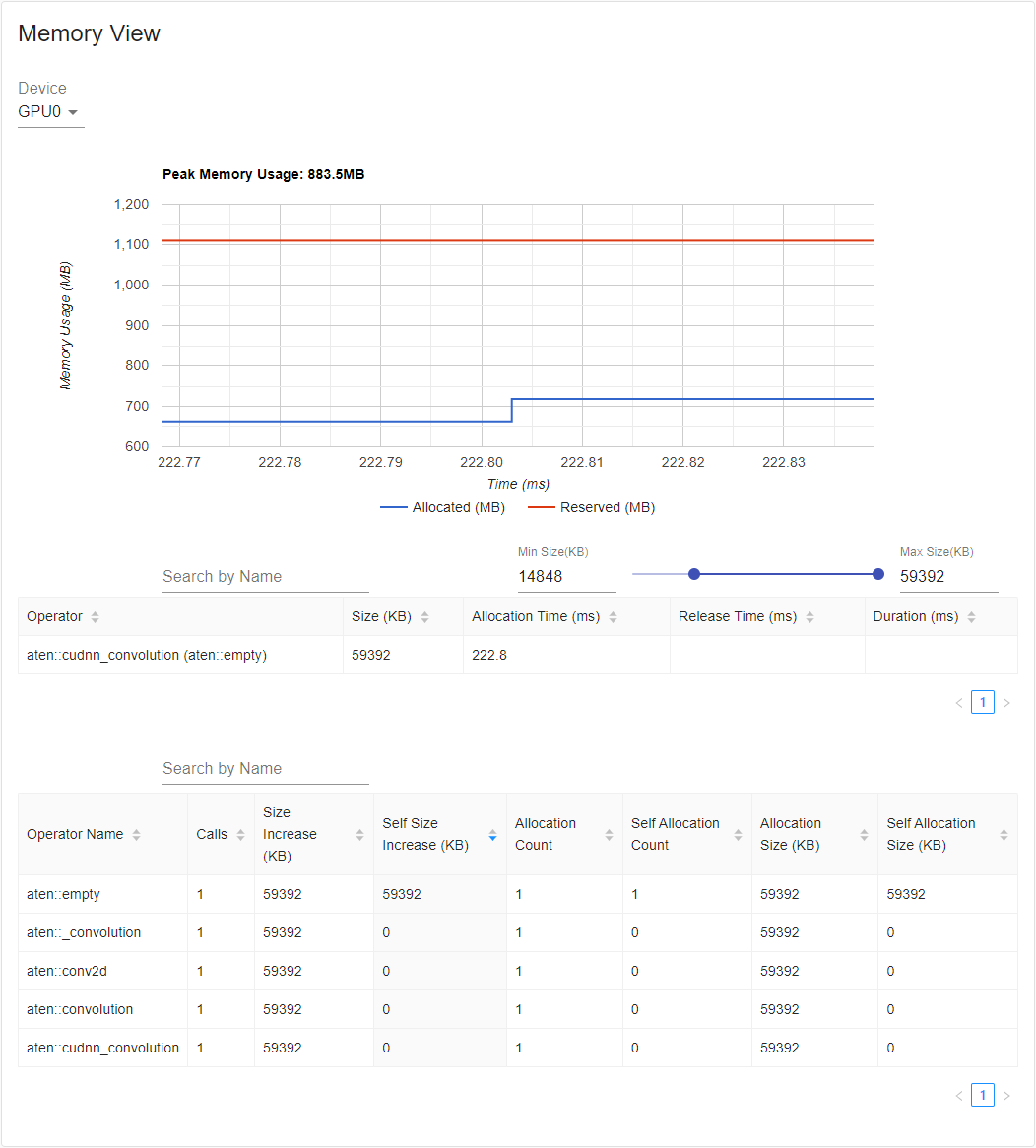The profiler records all memory allocation/release events and allocator’s internal state during profiling. The memory view consists of three components as shown in the following.
