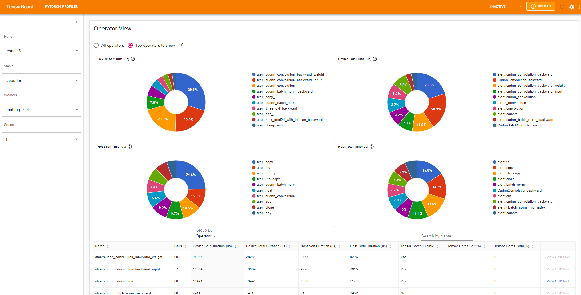 The operator view displays the performance of every PyTorch operator that is executed either on the host or device.