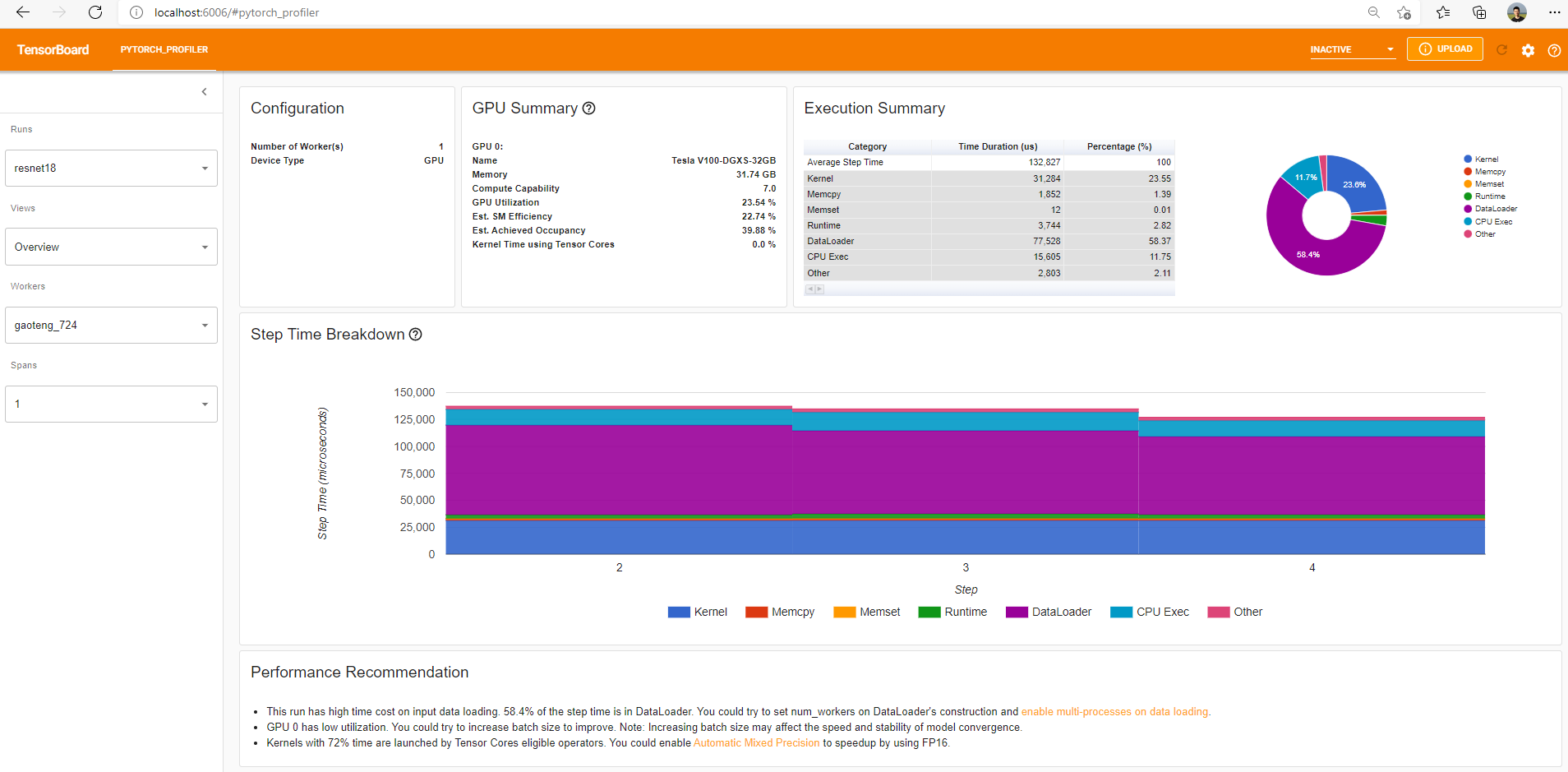 At the bottom of “Overview” page, the suggestion in “Performance Recommendation” hints the bottleneck is DataLoader.