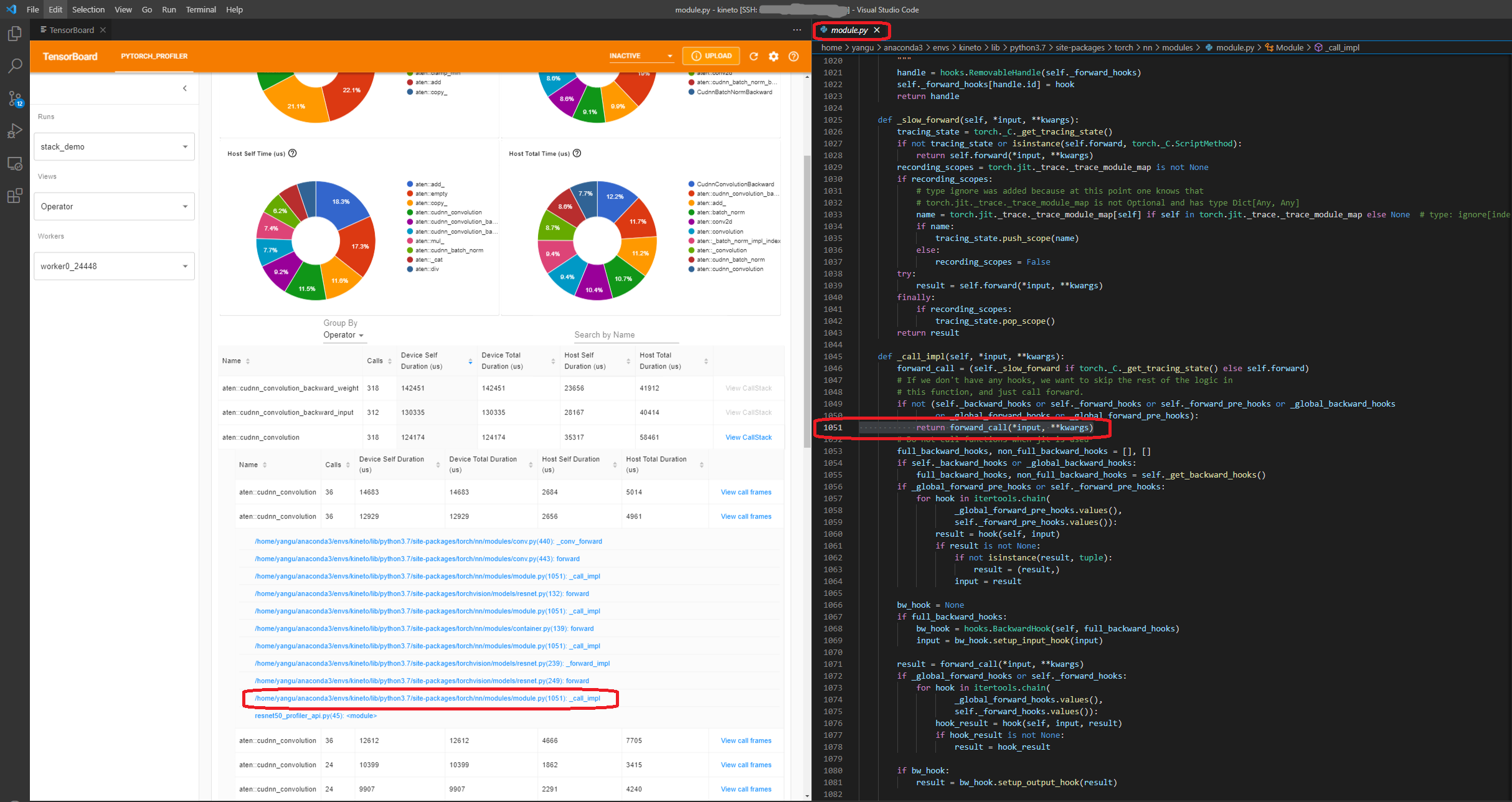 waitsteps, the profiler is disabled. Duringwarmupsteps, the profiler starts tracing but the results are discarded. This is for reducing the profiling overhead. The overhead at the beginning of profiling is high and easy to bring skew to the profiling result. Duringactivesteps, the profiler works and records events.on_trace_ready- callable that is called at the end of each cycle; In this example we usetorch.profiler.tensorboard_trace_handlerto generate result files for TensorBoard. After profiling, result files will be saved into the./log/resnet18directory. Specify this directory as alogdirparameter to analyze profile in TensorBoard.record_shapes- whether to record shapes of the operator inputs.profile_memory- Track tensor memory allocation/deallocation. Note, for old version of pytorch with version before 1.10, if you suffer long profiling time, please disable it or upgrade to new version.with_stack- Record source information (file and line number) for the ops. If the TensorBoard is launched in VS Code (reference), clicking a stack frame will navigate to the specific code line.